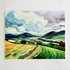 Expansive and dreamlike, Rural Serenity opens with a sweeping sky painted in soft blues and purples, where dynamic clouds drift above endless fields. Long strokes of yellow and layered greens create a rich sense of depth, guiding the eye through the landscape and beyond the distant mountains. Nestled quietly in the center, a few small homes hint at a slower rhythm of life—inviting you to imagine the calm and beauty of this rural escape.